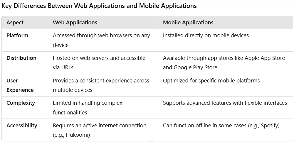 Although web apps and mobile apps share several similarities, they also have key differences. Mobile apps are designed to provide a more personalized and optimized user experience, whereas web apps offer greater flexibility and accessibility across multiple platforms. Let's examine some fundamental distinctions between web apps and mobile apps.
