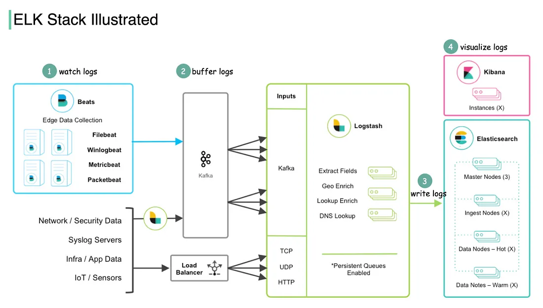 Load Balancer: Additional sources like network/security data, syslog servers, and IoT sensors can send data directly through a load balancer, ensuring even distribution of incoming data to Kafka.